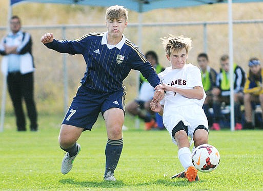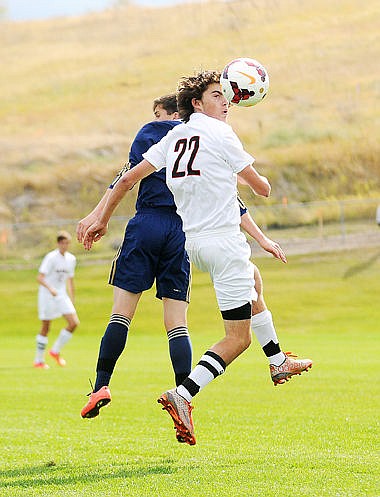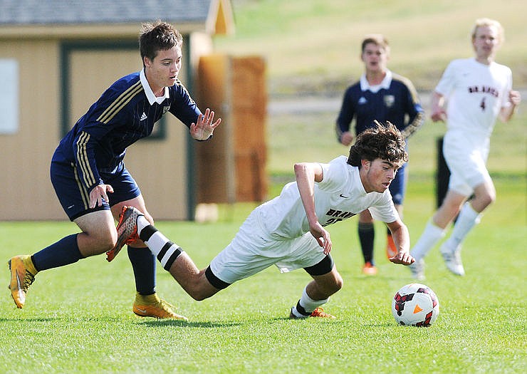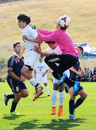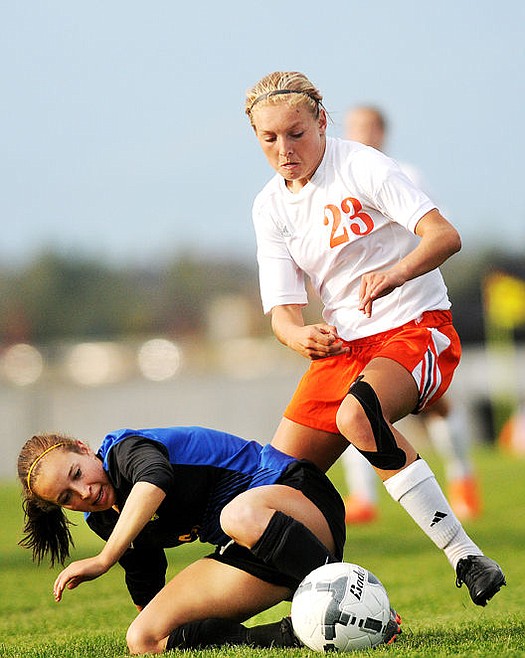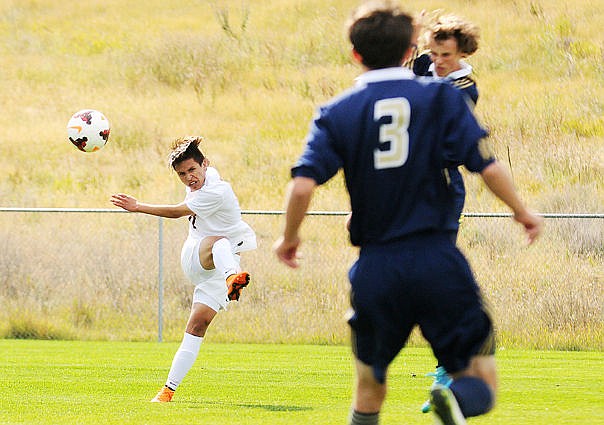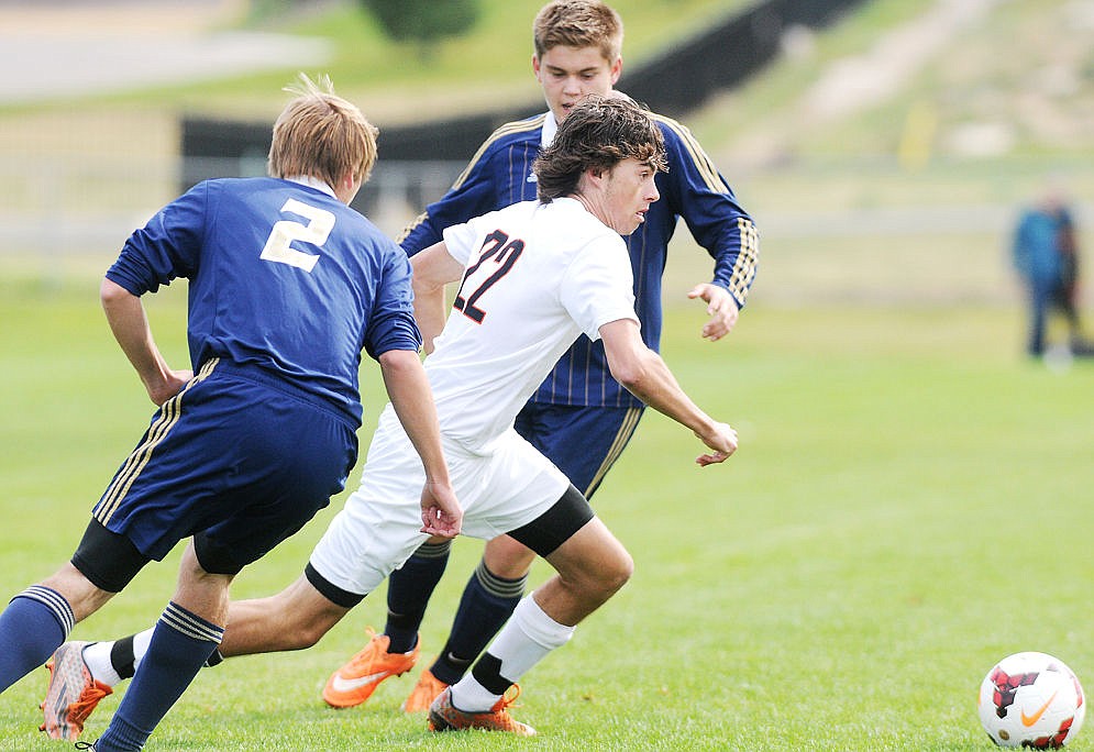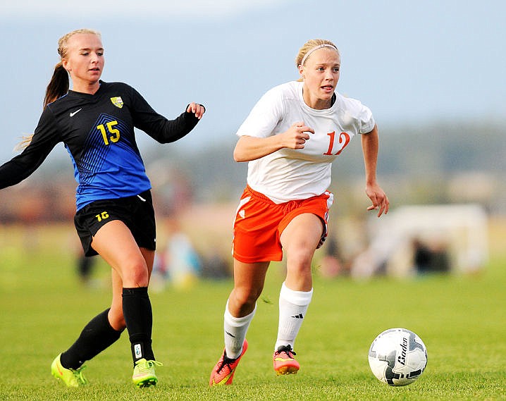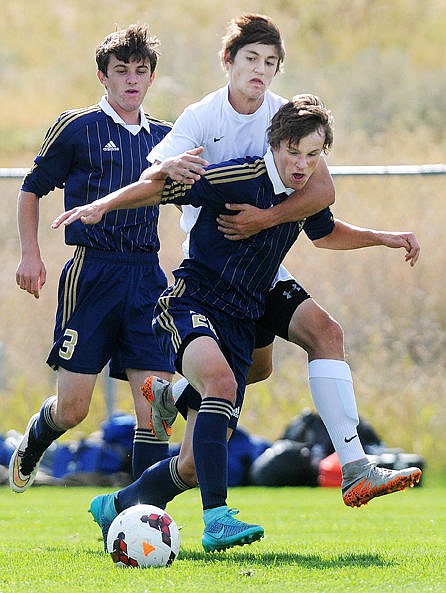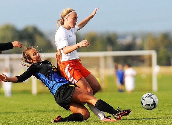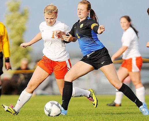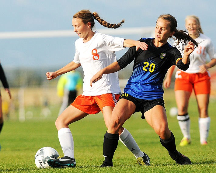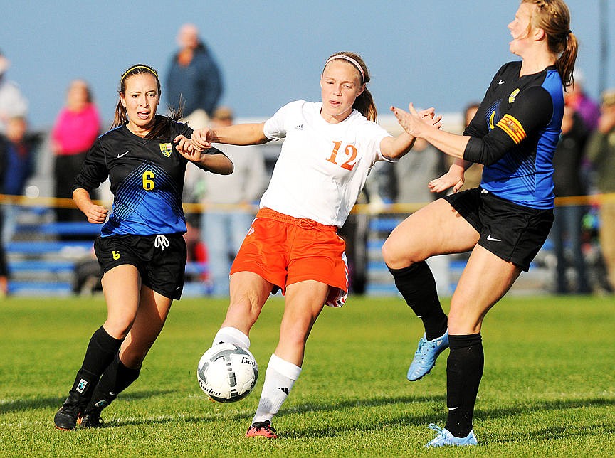 <p>Flathead's Shaye Thompson takes a shot between Big Sky defenders Kayla Farago (6) and Casey Nelson (4) during the first half on Tuesday. Thompson's shot bounced off the goalpost. (Aaric Bryan/Daily Inter Lake)</p>