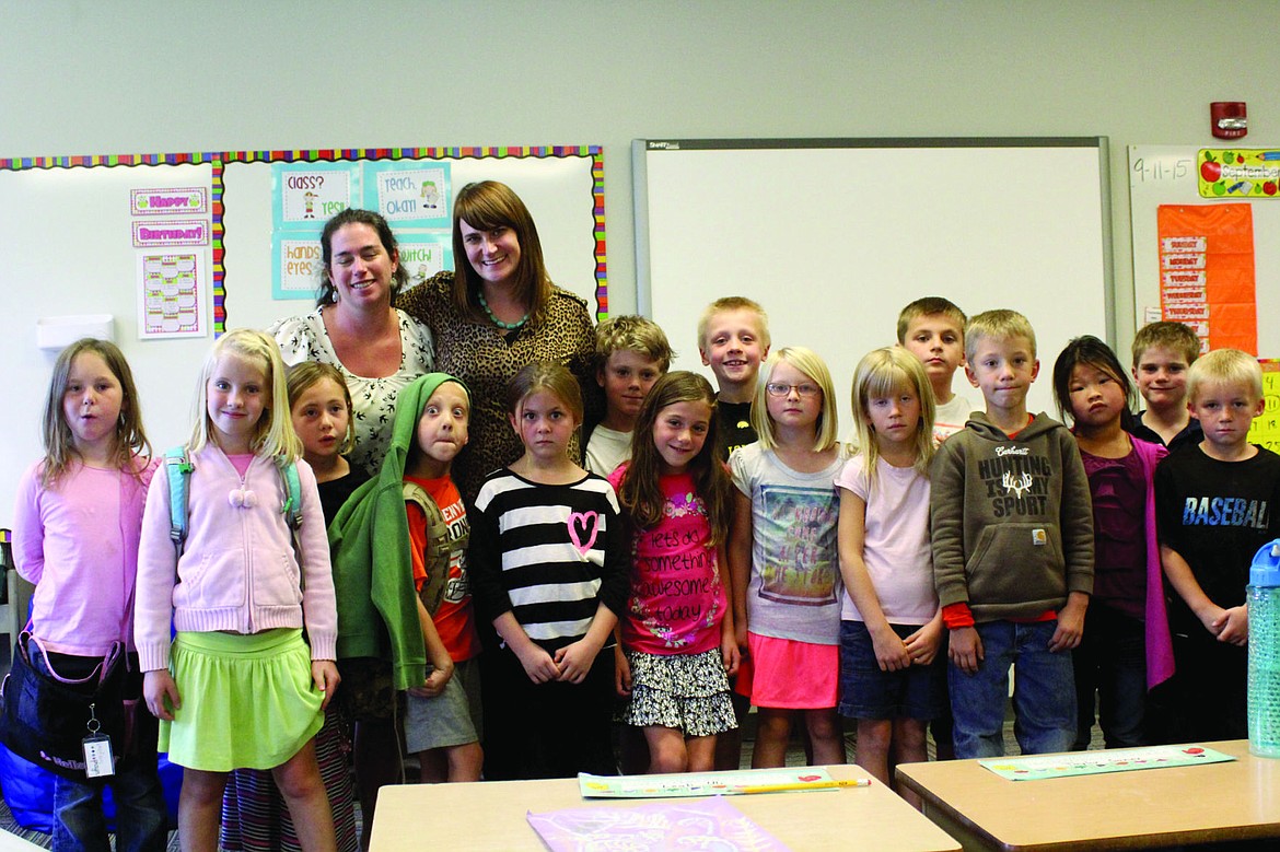 Rose Ayers and Kate Crouch pose with second graders in Rachael Cremer's class at Plains Elementary School.