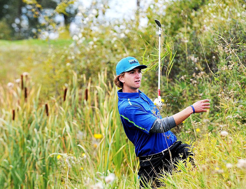 Glacier's Tommy Mann hits hit ball out of the rough on the 16th hole at Northern Pines during the Kalispell Invitational on Thursday. (Aaric Bryan/Daily Inter Lake)