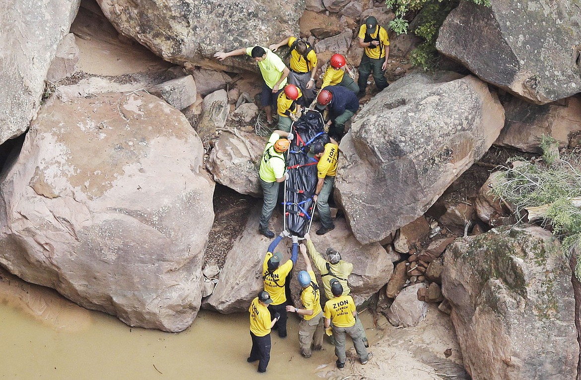 Search and rescue team members carry a body after it was found along Pine Creek, Wednesday, Sept. 16, 2015, in Zion National Park, near Springdale, Utah. Authorities are searching for other hikers killed in flash flooding that swept through a narrow canyon at Utah's Zion National Park. (AP Photo/Rick Bowmer)