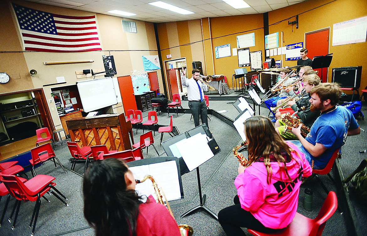 Teacher Sky Thoreson, junior Bjorn Thorness and other members of the Jazz Ensemble warm up on Tuesday morning at Bigfork High School. (Brenda Ahearn photos/Daily Inter Lake)