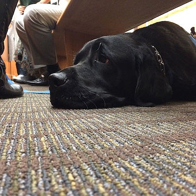 Ken was trained specifically for courthouse duty. He toilets on command and is generally imperturbable due to intense socialization and stepped noise desensitization that began when he was about eight weeks old.