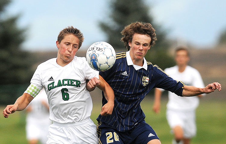 Glacier’s Colton Becker fights off Missoula Big Sky’s Walker Fromm to get to the ball during Saturday afternoon’s Western AA soccer match at Glacier High School. (Aaric Bryan/Daily Inter Lake)