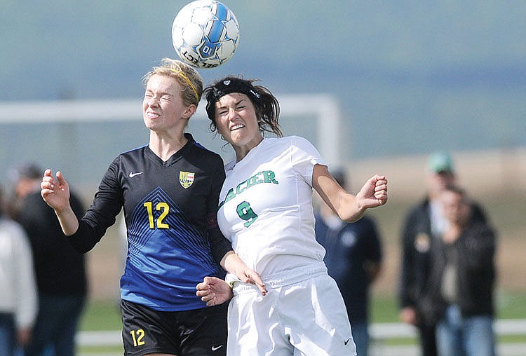Glacier’s Destiny Dachs (right) and Missoula Big Sky’s Nicki Nimlos battle for a header during second half Western AA soccer action at Glacier High School on Saturday. (Aaric Bryan/Daily Inter Lake)