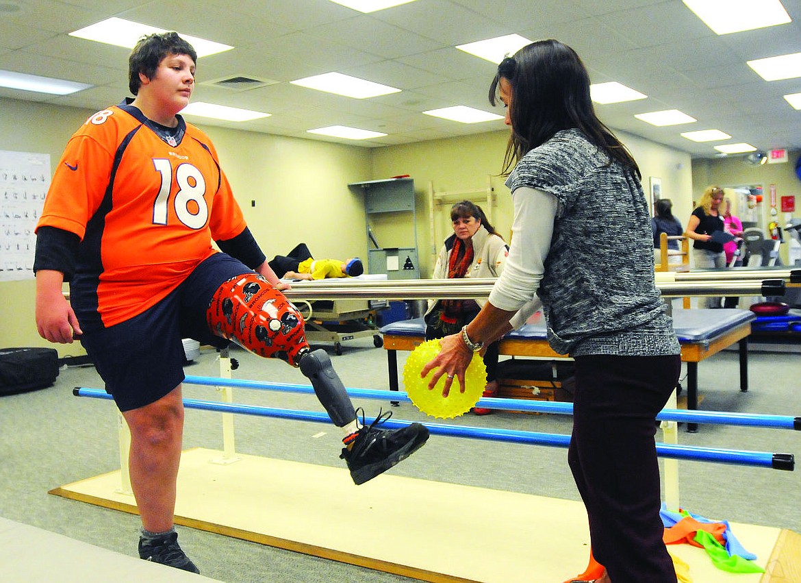 Skyler Schwegel does a drill with his physical therapist Beth Gunlikson to help him improve his stability at The Summit on Tuesday. Schwegel goes to physical therapy four to five times a week.