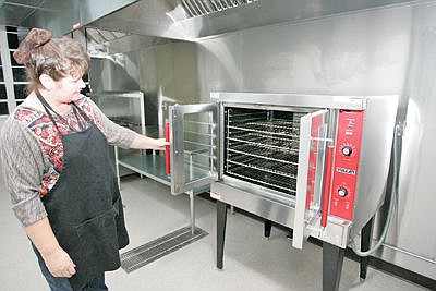 Assistant cook Charlene Snyder shows off the new convection oven early Monday morning, the first day the new kitchen will be used to feed the district's 450 hungry students.