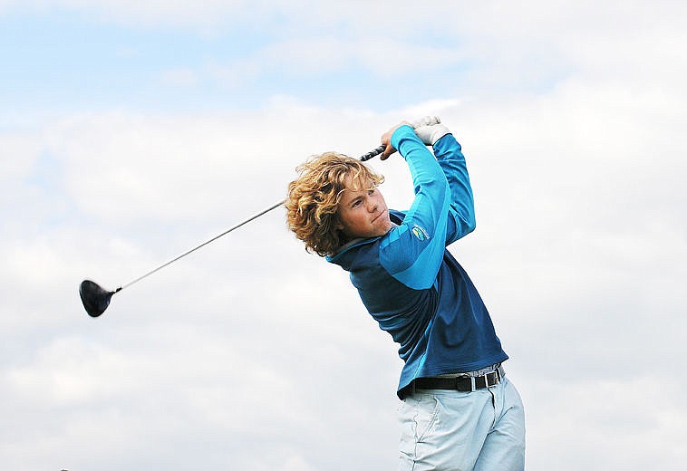 Flathead's Ryan Keenan smashes a drive from the 18th tee at the Northern Pines Golf Course during the Kalispell Invitational on Thursday. (Aaric Bryan/Daily Inter Lake)