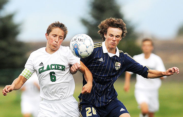 Glacier's Colton Becker fights off Big Sky's Walker Fromm to get to the ball during the Wolfpack's 6-1 blowout at home on Saturday. (Aaric Bryan/Daily Inter Lake)