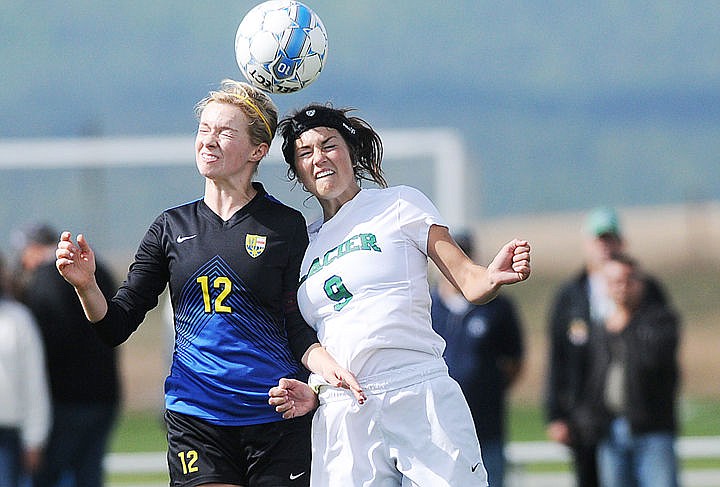Glacier's Destiny Dachs and Big Sky's Nicki Nimlos battle for a head ball during the second half at Glacier on Saturday. (Aaric Bryan/Daily Inter Lake)