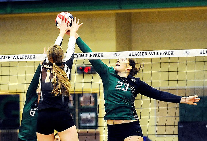 Glacier's Nikki Krueger stretches out to tip the ball over Helena Capital's Savannah Perschon during the Wolfpack's 5-game loss at home on Saturday. (Aaric Bryan/Daily Inter Lake)