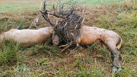 COEUR d'ALENE — Two bull elk died after a bloody fight in which both were gored multiple times, their antlers got locked and they ended up tangled in a barbed wire property fence.