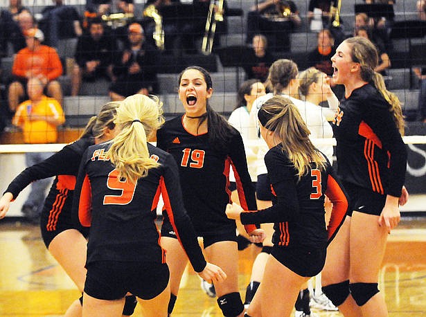 Flathead's Alyssa Wisher (19) celebrates a kill during the fourth game with her teammates during the crosstown match against Glacier at Flathead on Tuesday. (Aaric Bryan/Daily Inter Lake)