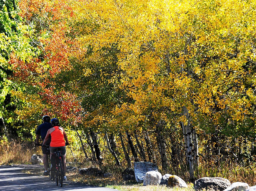 A pair of cyclist ride past an Aspen stand on the Great Northern Historical Trail west of Kalispell on Wednesday. (Aaric Bryan/Daily Inter Lake)
