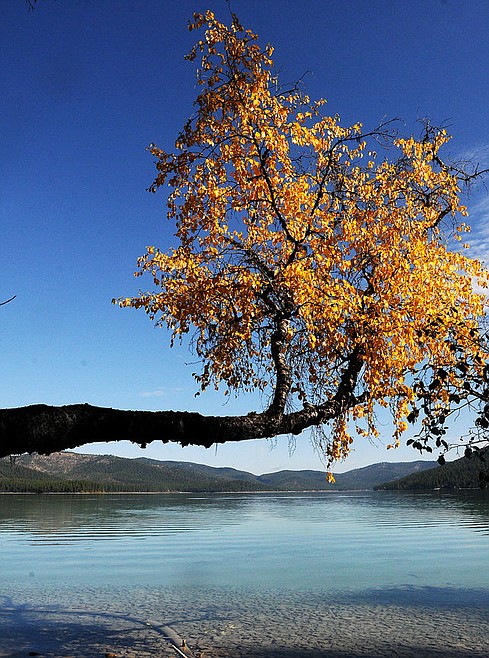 Leaves on a branch turn yellow on the shore of Ashley Lake on Wednesday, the first day of fall. (Aaric Bryan/Daily Inter Lake)