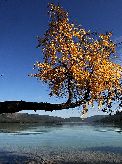 Leaves on branches overhanging the shore of Ashley Lake shimmer yellow in the sunlight on Wednesday, the first day of fall. (Aaric Bryan/Daily Inter Lake)
