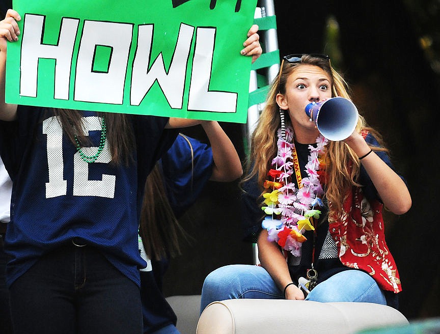 Olivia Malchi yells to the crowd as the float goes down First Avenue toward Legends Stadium during the Glacier Homecoming Parade on Friday. (Aaric Bryan/Daily Inter Lake)