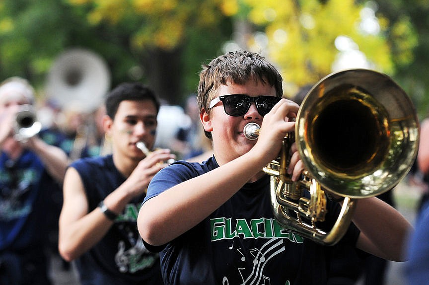 Nathan Mayhak plays the bar euphonium as the Glacier band marches during the parade. (Aaric Bryan/Daily Inter Lake)