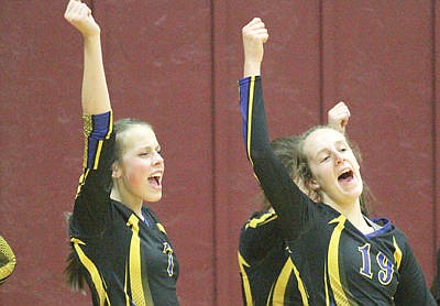 The bench explodes as Libby aces a serve in the second vs. Troy Thursday evening. With Emily Mossburg, left, and Jayden Winslow.