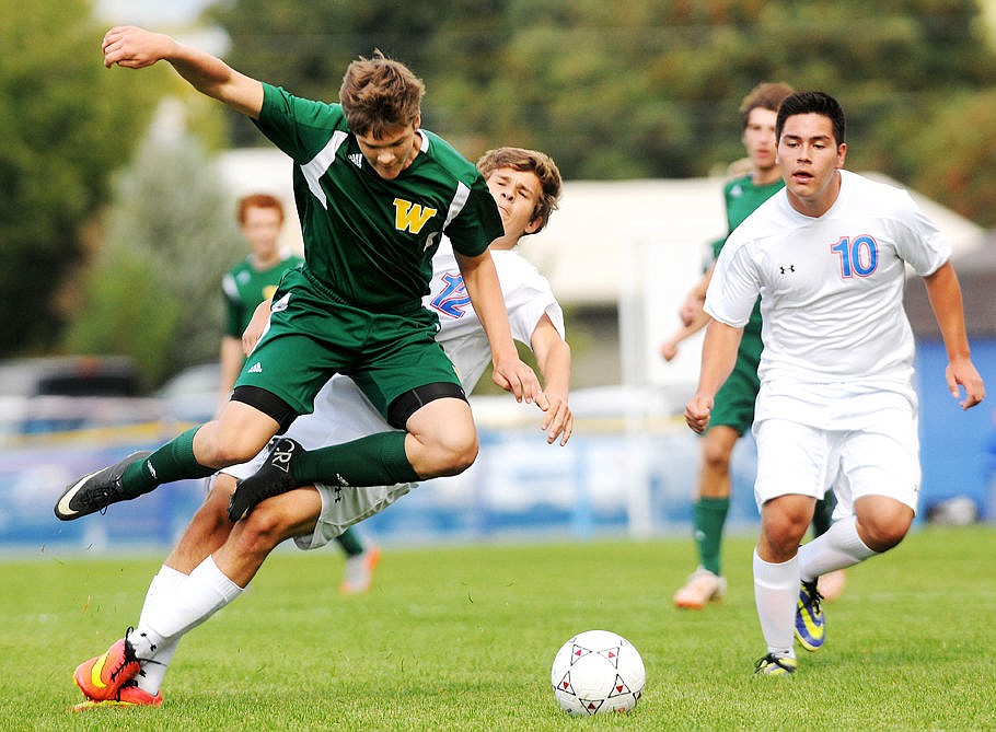 Whitefish's Avery HIrsch and Columbia Falls' Daniel Carr get tripped up going for the ball during the first half on Saturday in Northern A soccer play in Columbia Falls. (Aaric Bryan/Daily Inter Lake)