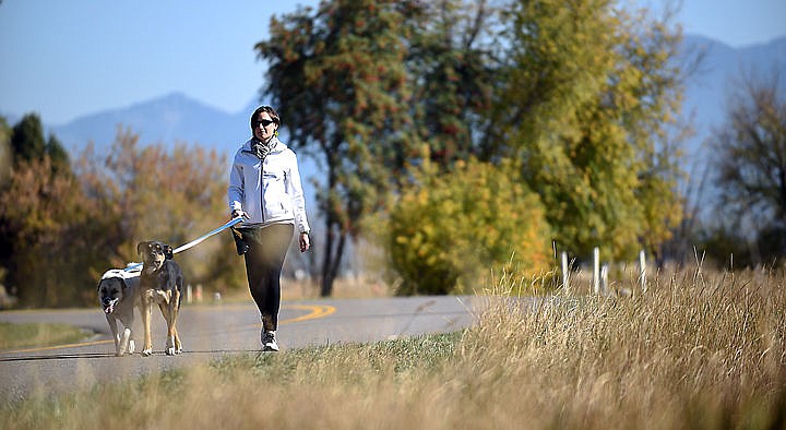 Ashley Wenz of Somers takes her dogs Max and Kiva for a walk in Somers on Monday afternoon, September 28. (Brenda Ahearn/Daily Inter Lake)
