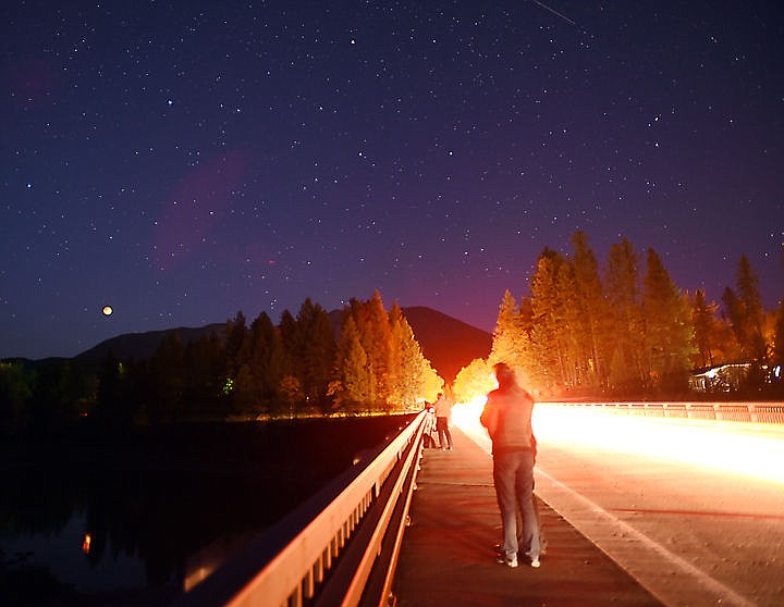 The bride crossing the Middle Fork Flathead River in West Glacier was a popular viewing point for the lunar eclipse on Sunday night, September 27. In the foreground, Martin and Kate Triplett of Great Falls, watch as the full moon, in left of the frame, takes on a red cast as it crosses through the shadow of the earth at 8:37 p.m. (Brenda Ahearn/Daily Inter Lake)