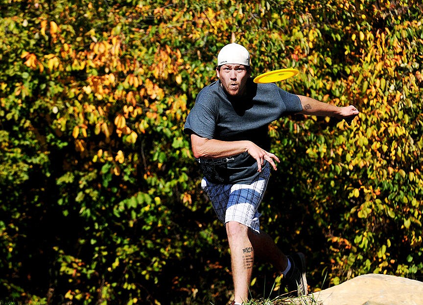 Dave Engle hurls a disc while playing disc golf with Cody Morrison at Lawrence Park on Wednesday. The two play disc golf at the park about five times a week. (Aaric Bryan/Daily Inter Lake)