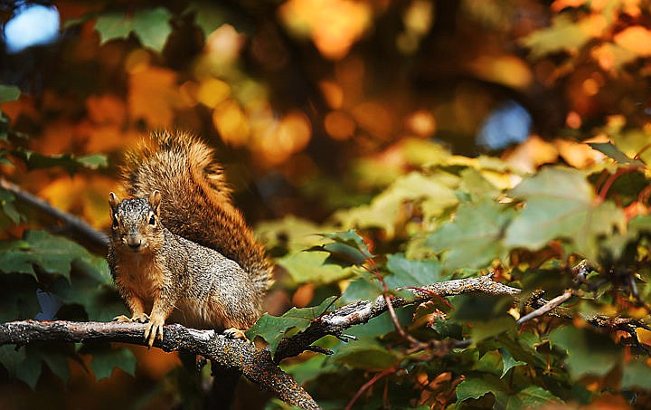 A curious squirrel perches on a branch among the bright colors of fall on Wednesday in Whitefish. (Brenda Ahearn/Daily Inter Lake)
