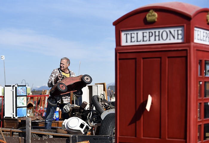 Dale Stere removes a pedal car made in the mid 20th century from a trailer at the Creston Auction site on Friday. (Aaric Bryan/Daily Inter Lake)
