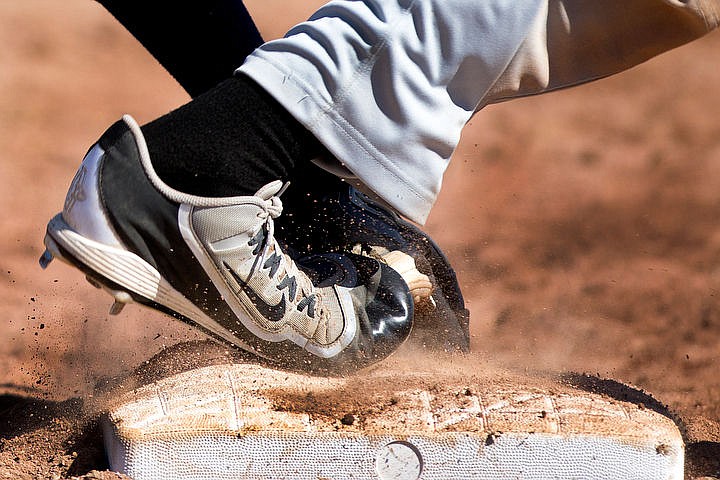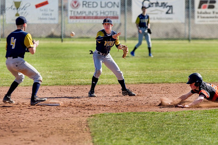 <p>Post Falls junior shortstop Wyatt Setian loses control of the ball as Timberlake's Gage Wells steals second on Friday at Post Falls High School.</p>