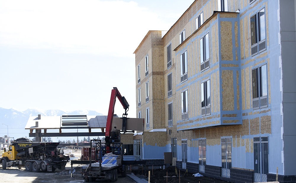 Cement is poured and sheetrock is moved at the SpringHills Suites Marriott on Reserve Drive on Friday. (Aaric Bryan/Daily Inter Lake)