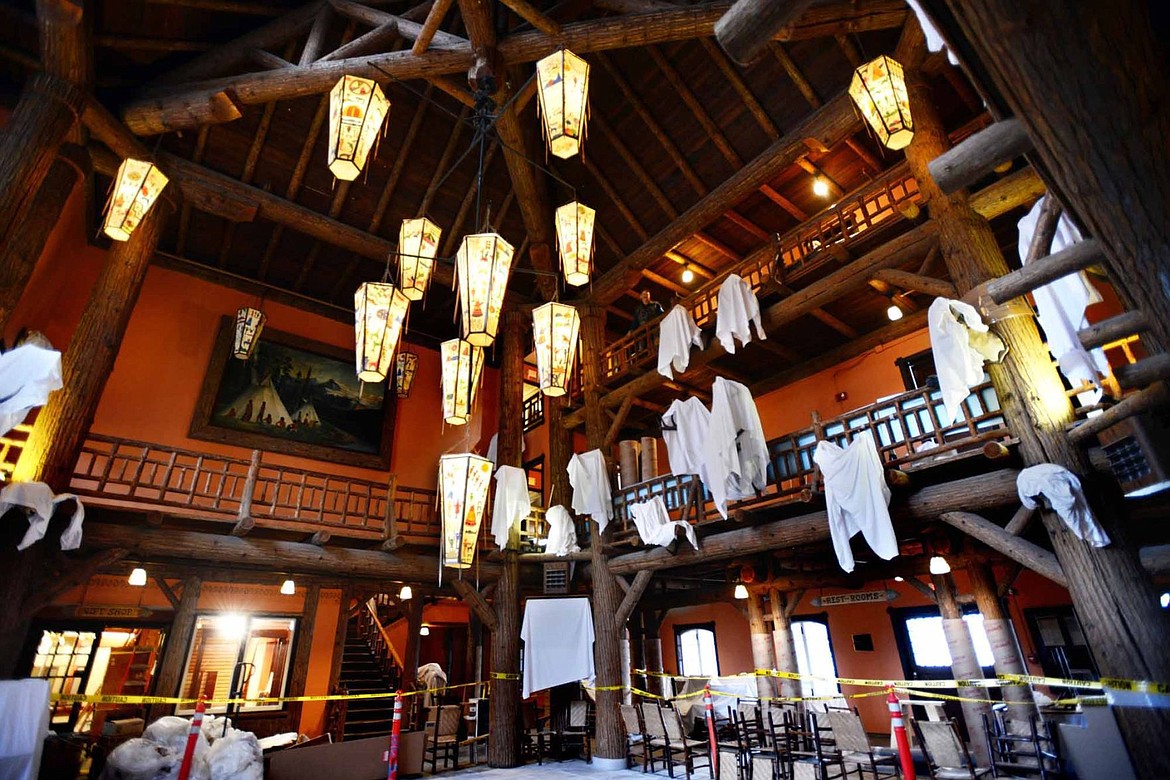 Lake McDonald Lodge in Glacier National Park is undergoing a $3 million renovation. Here the main lobby is shown with white protective sheets draped over animal mounts and other historic icons. (Brenda Ahearn/Daily Inter Lake)