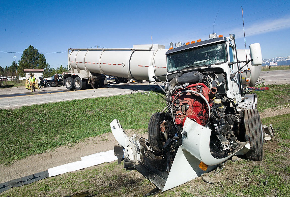 A witness said the pickup truck was stopped at the intersection of Kelley Road when it appeared the male driver reached over to get something, let his foot off the brake and went into the path of the semi. The tanker with a pup trailer hit the brakes, but the two collided at near highway speeds. The semi hit the driver’s side of the pickup and the Dodge flew down the roadway and then struck a Suburban head-on in a resident’s driveway. The tanker ended up jack-knifed across the road, the tractor in the far ditch.