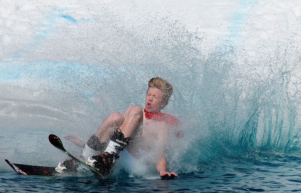 Adam Cazell, dressed as baby Trump, wrecks during the second round of the Whitefish Mountain Resort 2016 Pond Skim on Saturday. (Aaric Bryan/Daily Inter Lake)