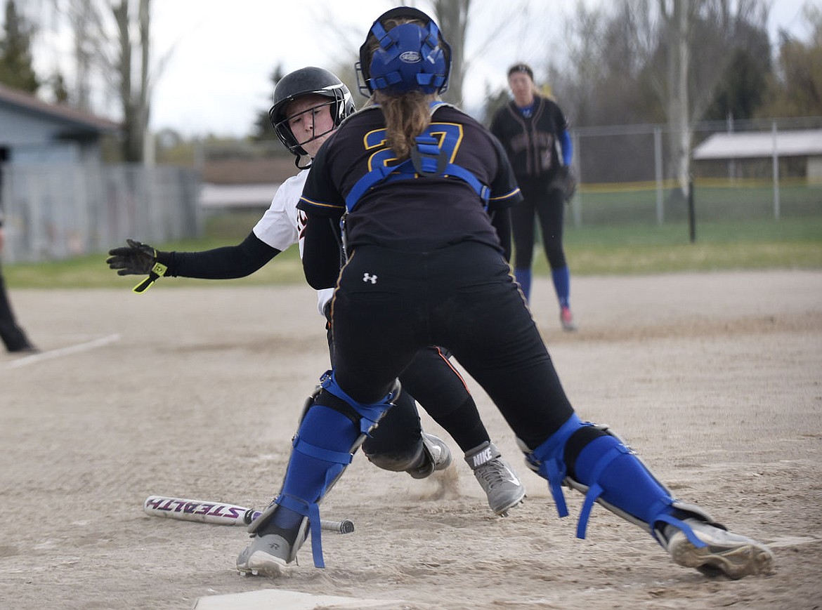 Flathead's Kylee Meredith is tagged out by Missoula Big Sky's Morgan Johnson as she slides into home during the bottom of the second inning of the Bravettes' 12-0 loss at Gene Boyle Field on Tuesday. (Aaric Bryan/Daily Inter Lake)