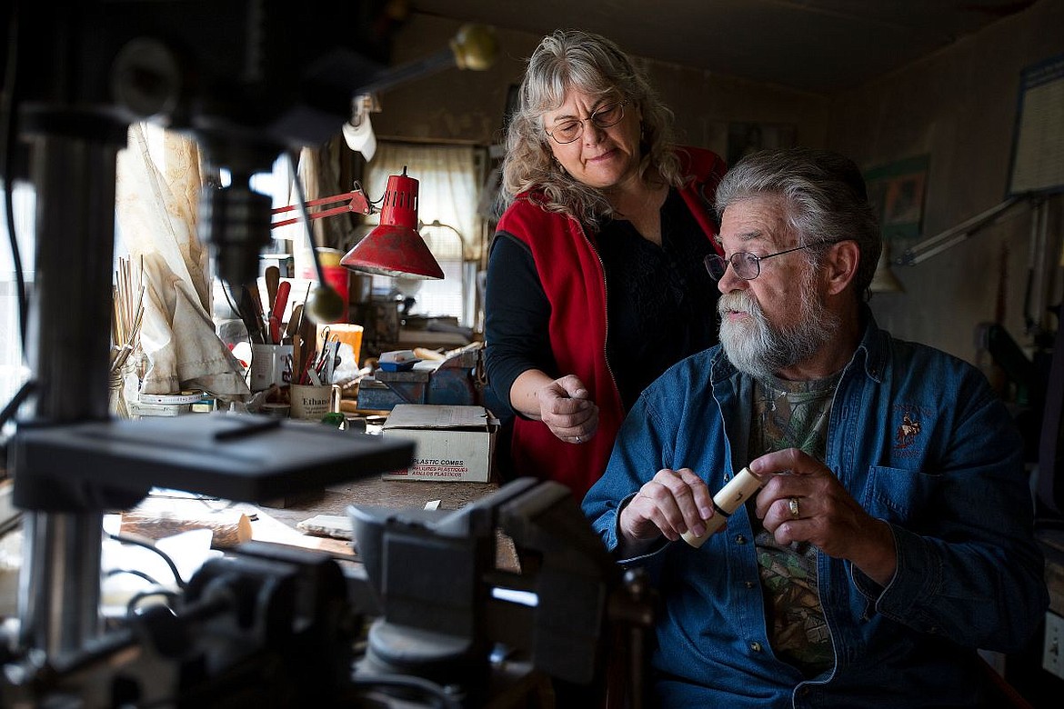 Mike, 70, grew up hunting and fishing with his brothers on the family farm in Illinois. Debbie, 61, draws on her love of nature for inspiration. Her nickname is "Coyote Woman."