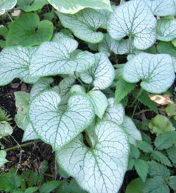 I’ve never understood why people wanted to “get rid” of their moss. It’s beautiful — mossy rocks and logs make for gorgeous backdrops as well as tuck-in plantings. My mossy, shady little hideaway garden path wanders through moss-planted Digitalis (foxglove), Aconitum (monkshood), Brunnera (pictured), Tiarella (foam flower), Huechera (Coral bells), Hosta, Ferns, Hellebore,Oriental (water-loving) Iris, Pulmonaria, Astilbe, and a host of native “encroachers” welcomed with open arms. These include Dewberry, Bloodroot, Solomon’s seal, trillium, Turk’s cap lily, Sweet Autumn Clematis, and many more — all growing happily in the rocky, mossy soil. Another bonus is the apparent contentment of three young cedar trees planted from tiny sprigs that have made it to over six feet tall — regardless of the area deer’s apparent taste for their succulent branches.