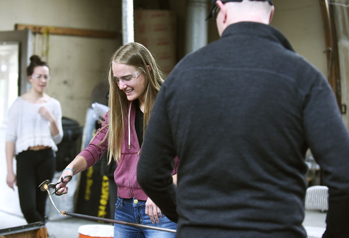 Whitefish junior Kate Doorn stretches glass as Farenhite Glass Works' Eric Klein holds during a chemistry field trip to Klein's studio on Friday. The chemistry class studied glass in February. (Aaric Bryan/Daily Inter Lake)