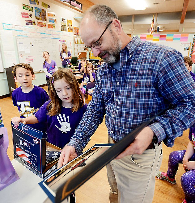 Family Assistance Specialist for the Montana National Guard Lee Fretwell presents a flag to Madison Gilchrist and Joann Cutler’s third grade class on Friday morning, April 15, at Trinity Lutheran School in Kalispell. (Brenda Ahearn/Daily Inter Lake)