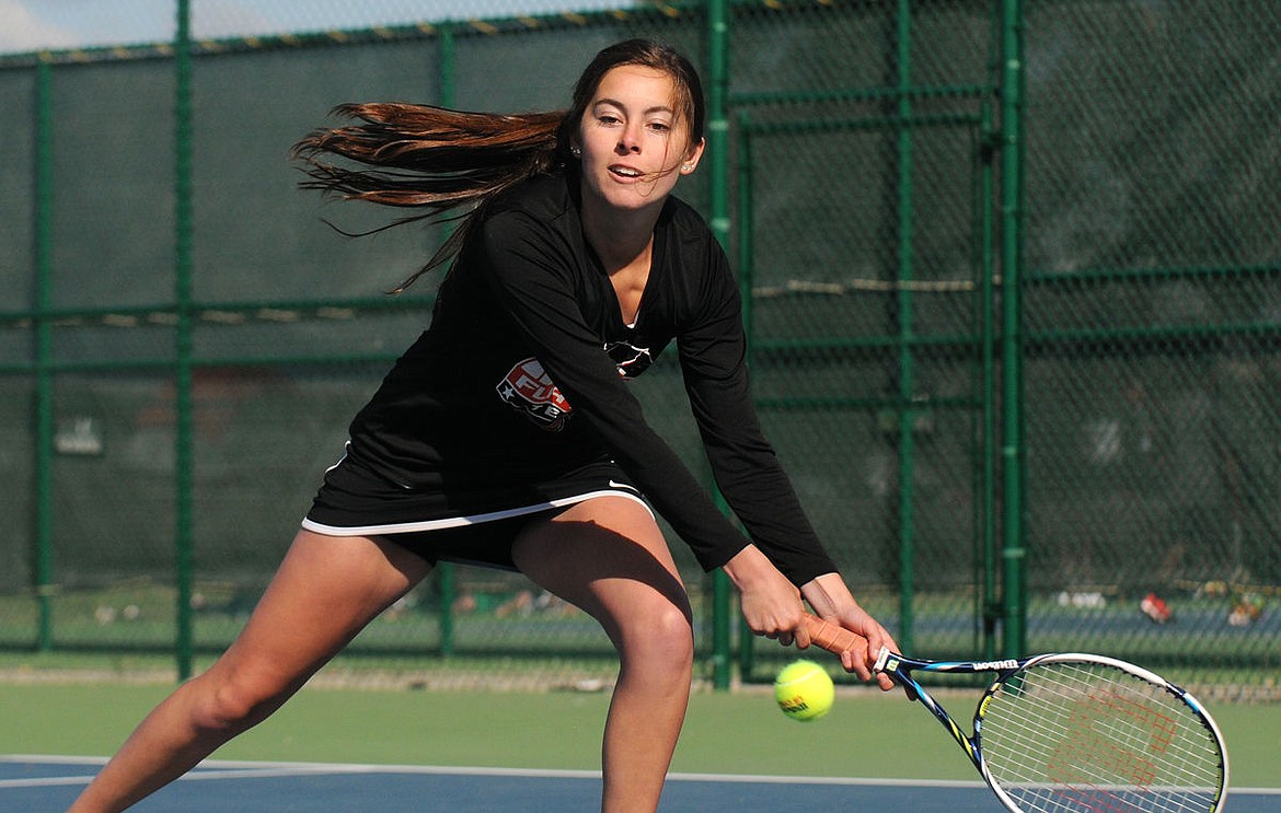 Flathead #2 singles player Rayna Darrow reaches for a ball in her match against Missoula Sentinel at Flathead Valley Community College on Saturday. (Aaric Bryan/Daily Inter Lake)