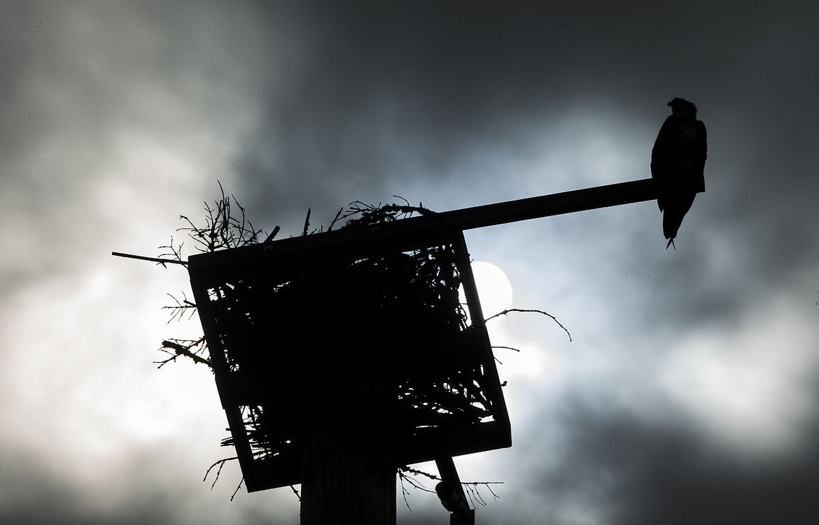 Young osprey have a natural instinct to flatten themselves in the bottom of the nest when a predator comes by. This makes them less visible over the edge of the nest. Crows, gulls and ravens have been known to prey on young osprey. Raccoons do, too, if the nest is at ground level.