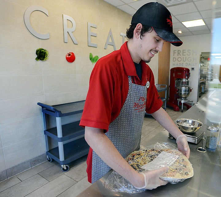 Alex Kuchenski makes a Signature Cowboy pizza on Monday, April 18, in Evergreen. The Cowboy has red sauce, pepperoni, sausage, mushrooms, black olives, herbs and cheese. (Brenda Ahearn/Daily Inter Lake)