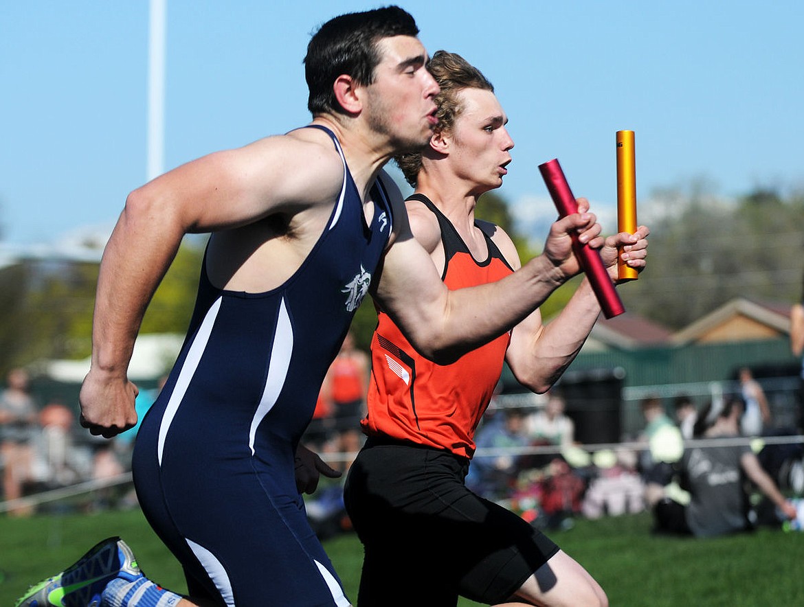 Flathead sophomore Bobby Lowry and Glacier sophomore Drew Turner are neck-and-neck as they sprint toward the finish line during the 4x100-meter relay of the Crosstown Track Meet at Legends Stadium on Tuesday. (Aaric Bryan/Daily Inter Lake)