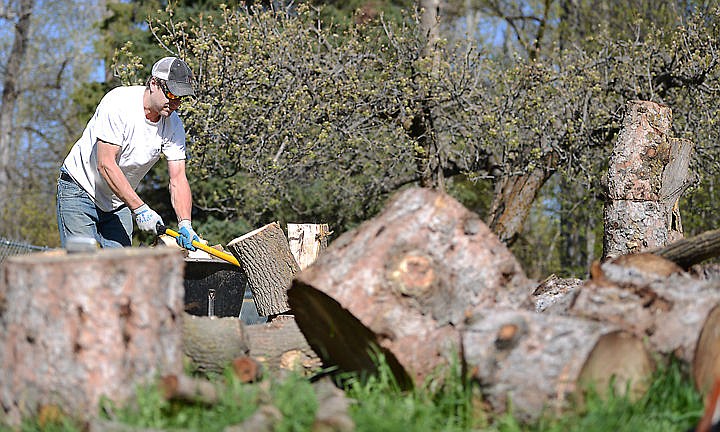 Boone Skibsrud splittings logs for his immediate and extended family on a bright spring day, April 18, on Willow Glen Drive in Kalispell. (Brenda Ahearn/Daily Inter Lake)