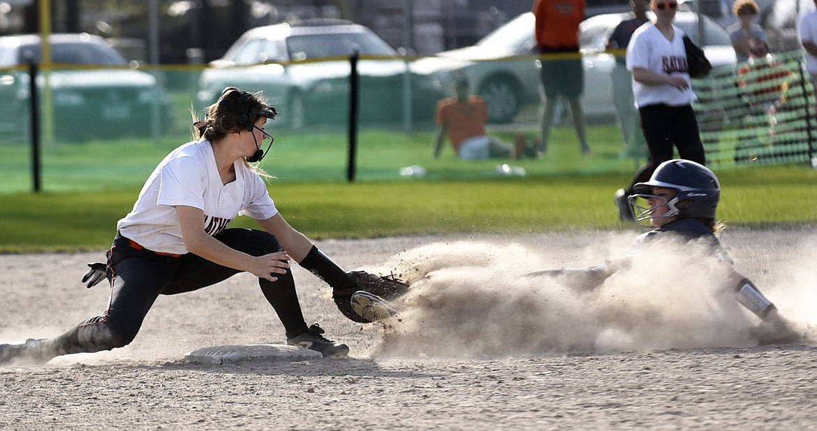 Glacier's Meg Hornby is tagged out by Abbie O'Brien for the final out of Flathead's 3-2 crosstown win on Thursday at Boyle Field at the Conrad Complex. (Aaric Bryan/The Daily Inter Lake)