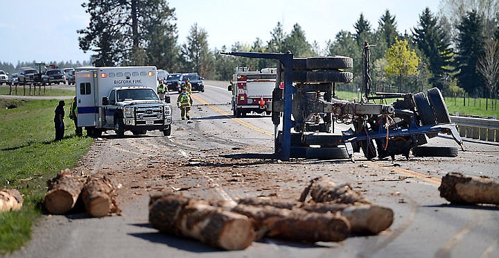 A fatal wreck involving a pickup truck and a logging truck spread across MT 35 on Thursday afternoon, near Creston. (Brenda Ahearn/Daily Inter Lake)
