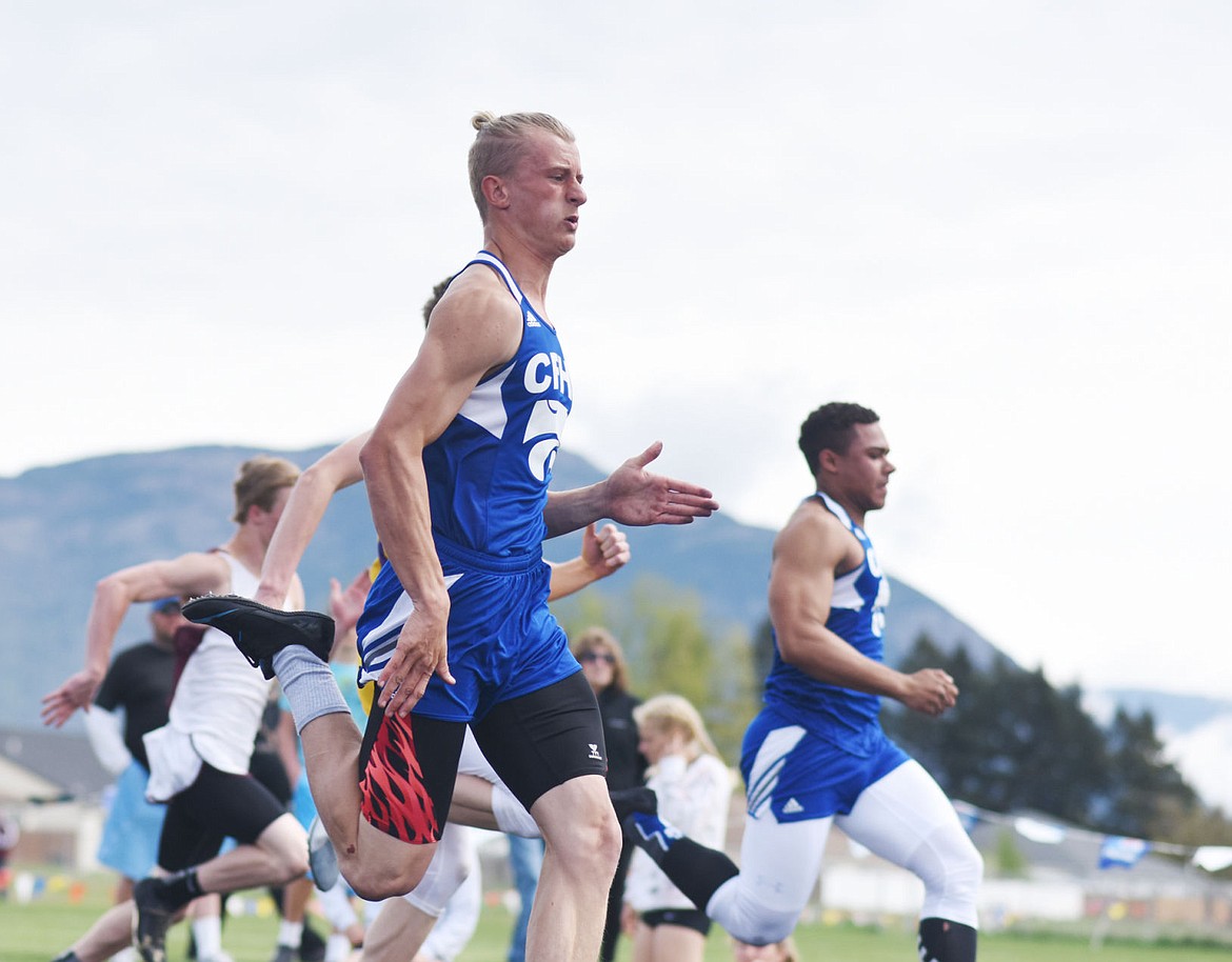 Tanner Dana of Columbia Falls gets out in front in the 100 meter finals at the Columbia Falls invitational Saturday. Dana would win the race. In the background is teammate Stephen Lindsey. (Chris Peterson/Hungry Horse News)