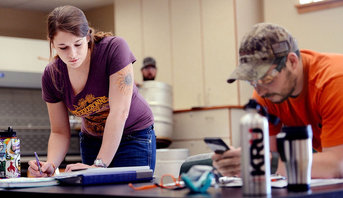 Hilary Robinson and Justin Eaton fill out brewing logs at Flathead Valley Community College.
