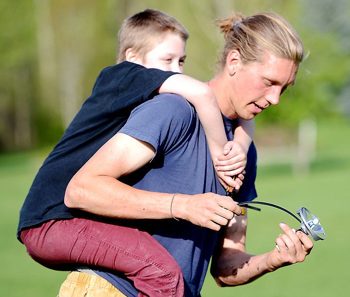 Rylan, 10, hops on the back of his “big brother” Leif Castren of Kalispell at Lawrence Park on Thursday, April 21, in Kalispell. Rylan has been in the Big Brothers Big Sisters program since 2014. (Brenda Ahearn/Daily Inter Lake)