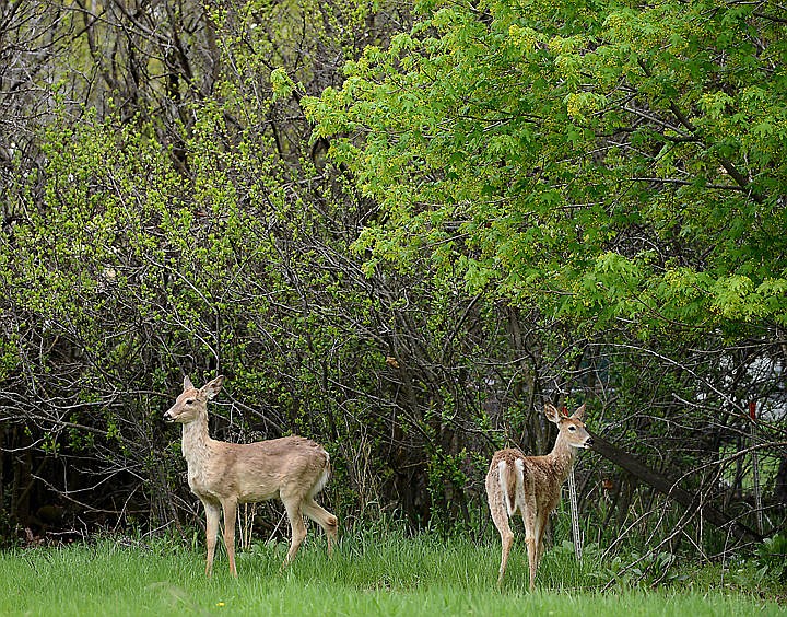 Deer forage for lunch on Monday afternoon, April 25, in a yard in Kalispell. (Brenda Ahearn/Daily Inter Lake)