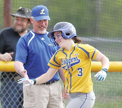 Coach Dean Thompson and Taryne Luscher exchange a celebratory "low five" after Luscher's home run over the center field fence scoring two with two out bottom of the first inning vs. Eureka April 22.